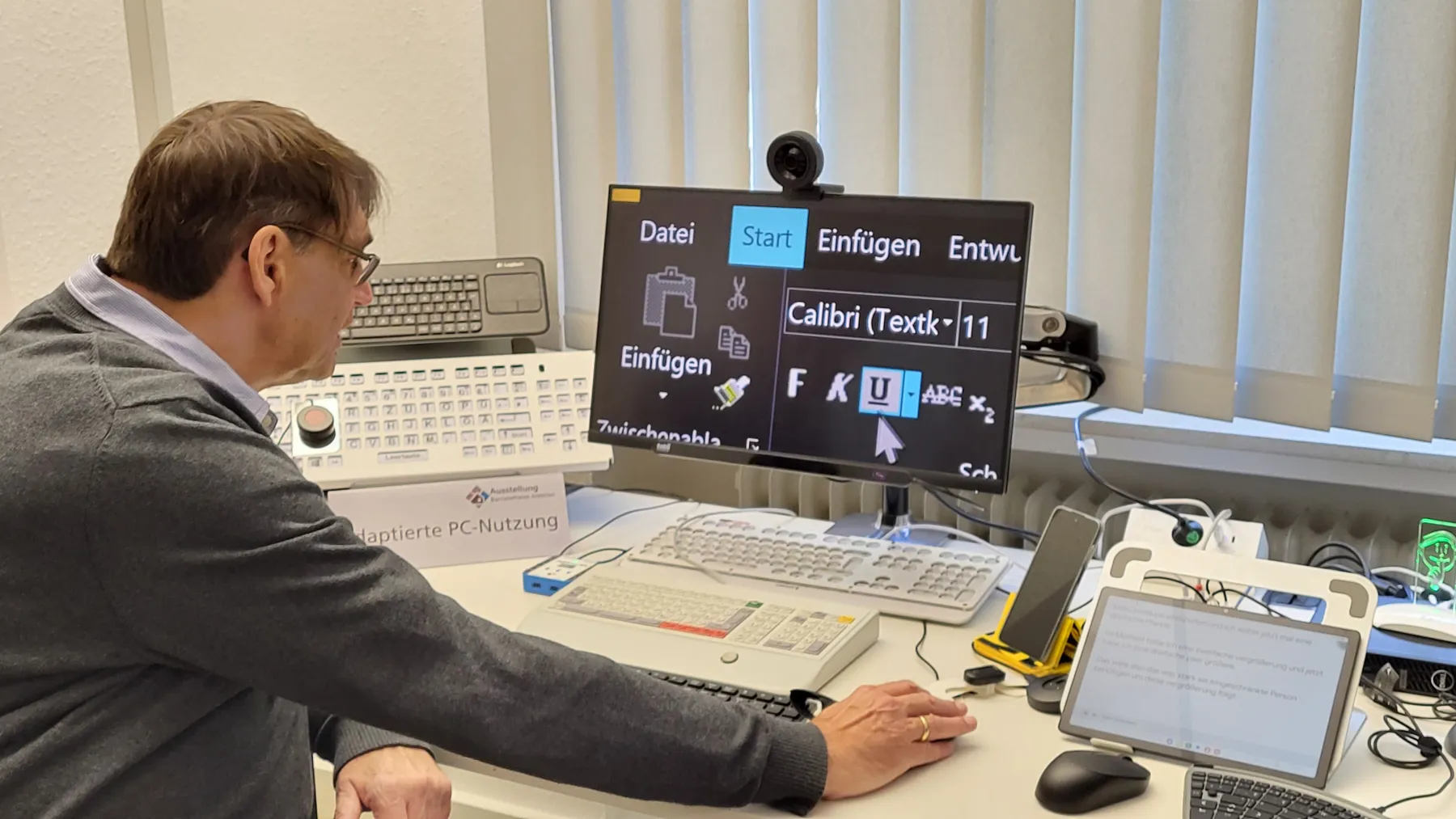 Wie Teilhabe im Berufsleben gelingen kann, wird an einem ergonomisch ausgerichteten und einem rollstuhlgerechten Büro-Arbeitsplatz mit speziellen Tastaturen und Mäuse gezeigt. Im Bereich barrierefreies Wohnen liegt ein Schwerpunkt auf digitalen Hilfsmitteln. Smart-Home-Technik kann beispielsweise Licht, Heizung, Türen oder Rollläden per Sprache oder App steuern. Sensoren erkennen Stürze und informieren automatisch Angehörige oder den Hausnotruf.